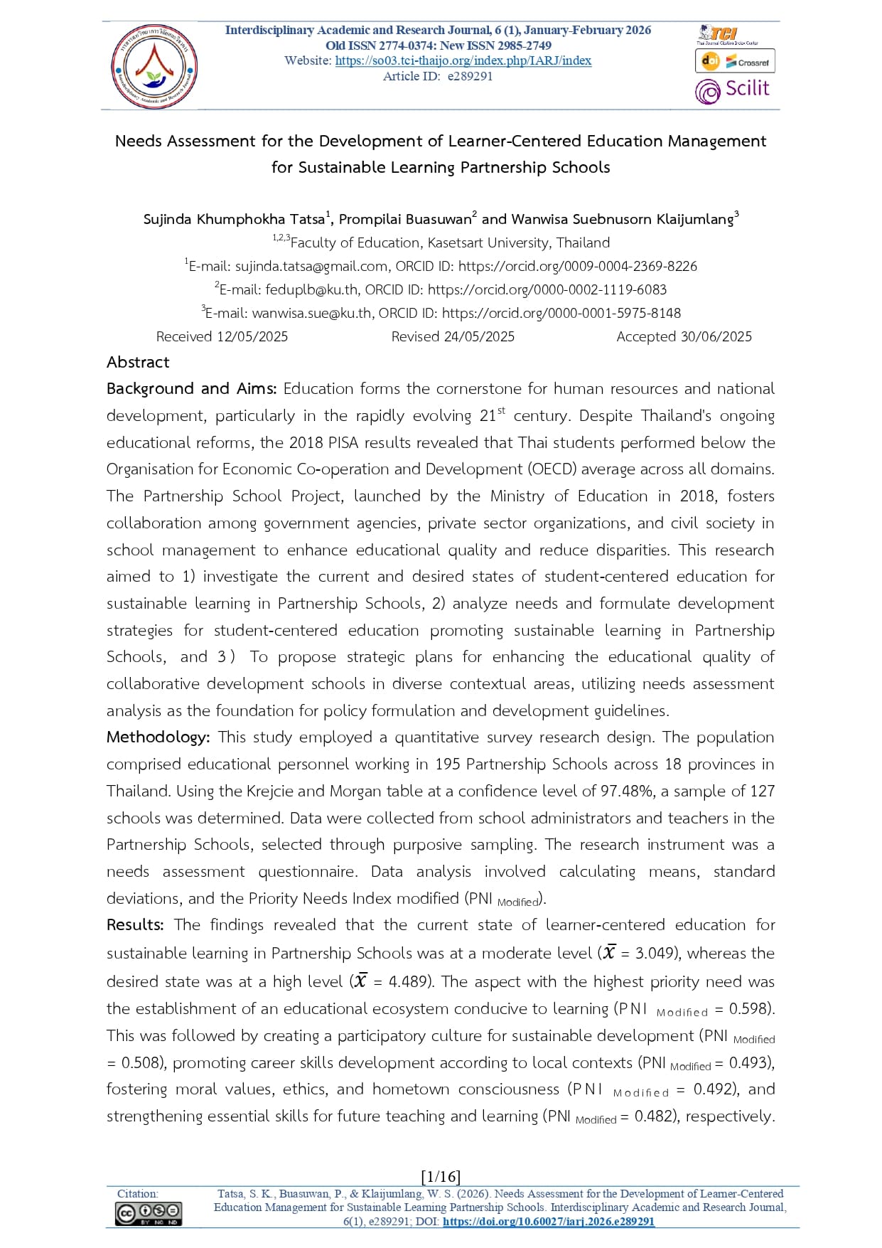 บทความวิจัย เรื่อง ความต้องการจำเป็นในการพัฒนาการจัดการศึกษาที่เน้นผู้เรียนเป็นสำคัญเพื่อการเรียนรู้อย่างยั่งยืนของโรงเรียนร่วมพัฒนา |